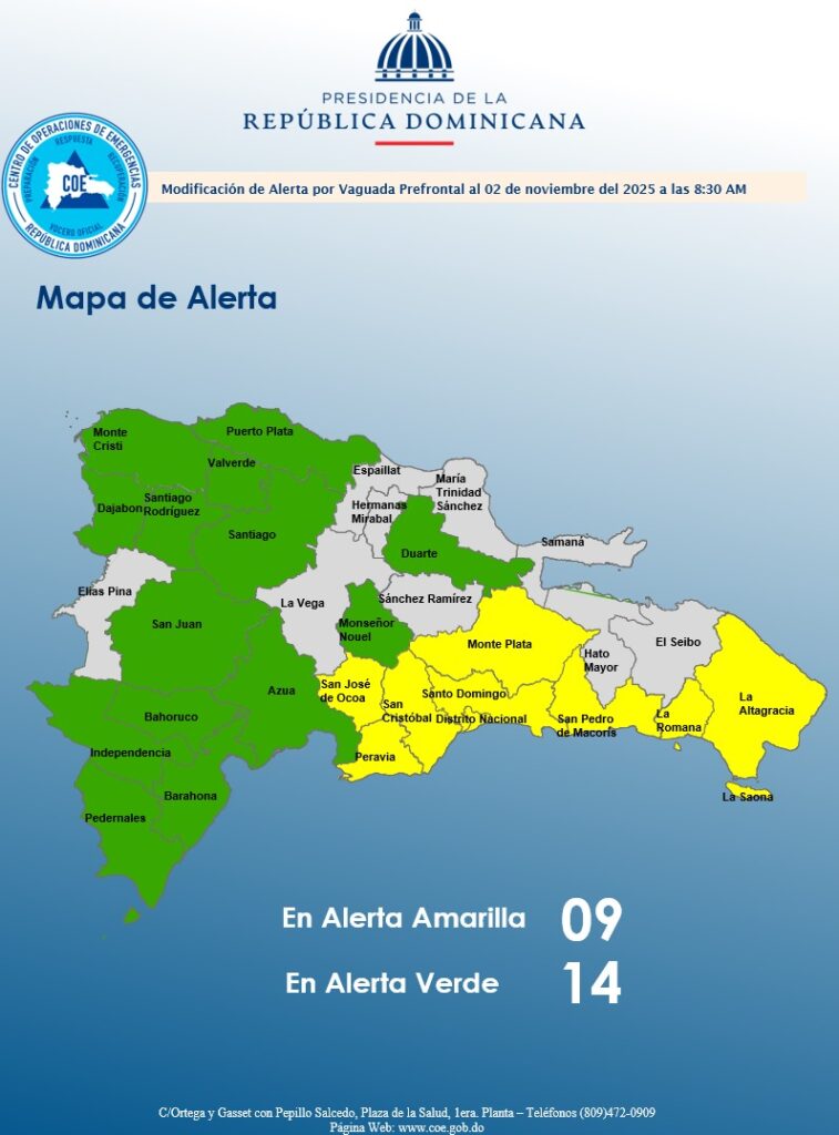Mientras que en alerta verde permanecen Duarte, Montecristi, Independencia, Bahoruco, Dajabón, Puerto Plata, Santiago, San Juan, Santiago Rodríguez, Barahona, Pedernales, Azua y Valverde.