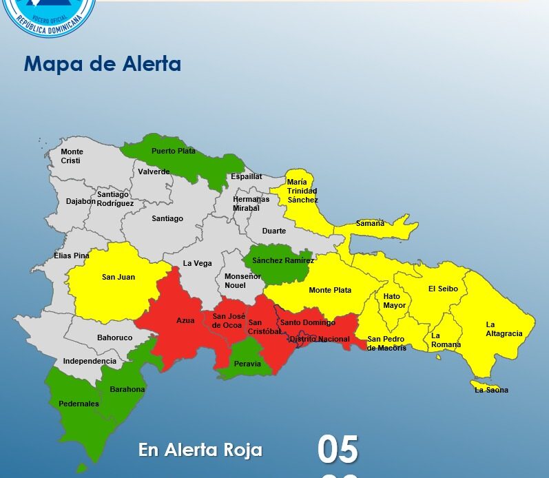 Las demarcaciones bajo alerta roja son: Distrito Nacional, Santo Domingo, San Cristóbal, San José de Ocoa y Azua, donde se prevé un alto riesgo de inundaciones urbanas y rurales, crecidas repentinas de ríos y cañadas, así como posibles deslizamientos de tierra.