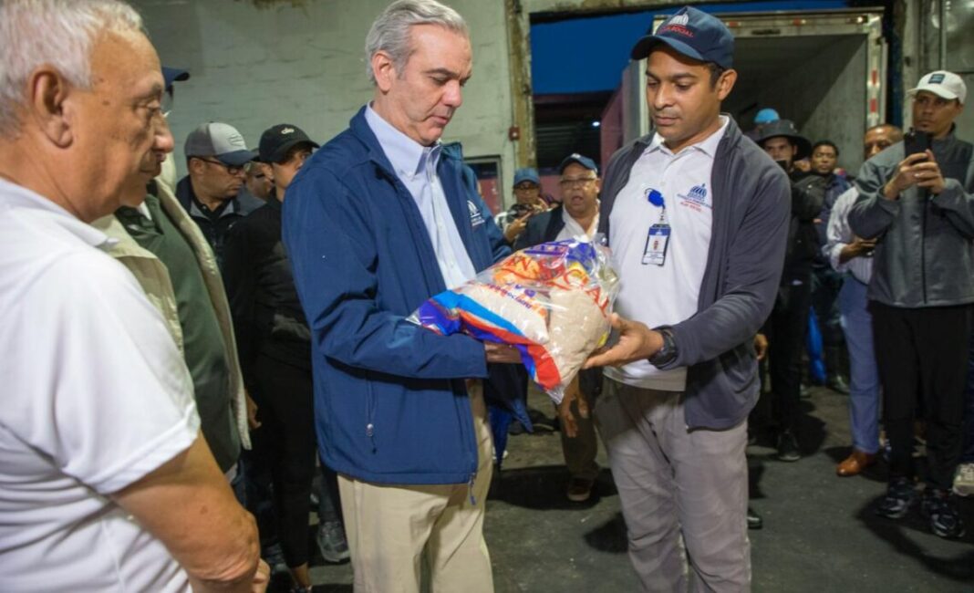 El presidente constató personalmente la selección y empaque de productos básicos, entre ellos arroz, sal, aceite, azúcar, leche, habichuelas, sardinas, coditos, avena y café, destinados a las familias damnificadas.