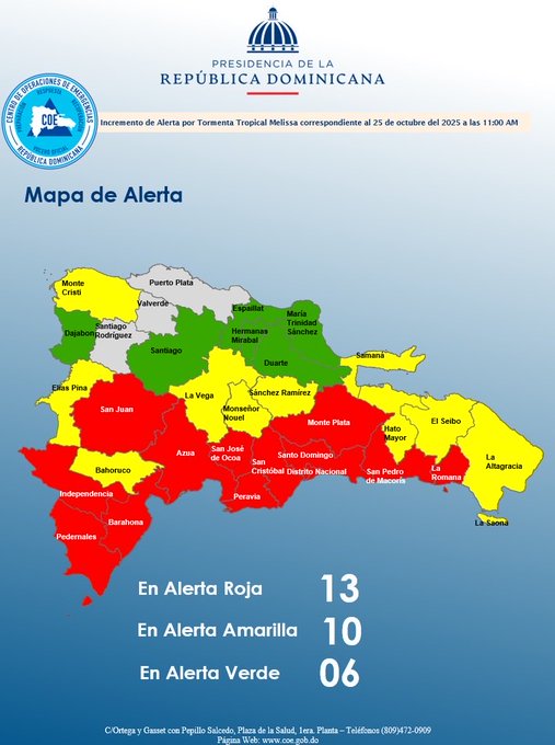 El Centro de Operaciones de Emergencias (COE) mantiene en alerta roja al Distrito Nacional y a las provincias Santo Domingo, San Cristóbal, San José de Ocoa, San Juan, Azua, Peravia, Pedernales, Barahona, San Pedro de Macorís, La Romana y Monte Plata por los efectos de la tormenta tropical Melissa.
